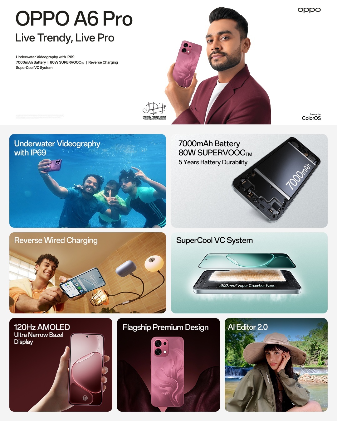 অপো এ৬ প্রো কেবল কোনো স্মার্টফোন নয়; আপনার জীবনকে আরও গতিময় করে তুলবে আউটডোরের এই নির্ভরযোগ্য সঙ্গী। এর ৭০০০ মিলিঅ্যাম্পিয়ার ব্যাটারি, ৮০ ওয়াট সুপারভুক ফাস্ট চার্জিং, রিভার্স চার্জিং, আইপি৬৯ টাফনেস, আন্ডারওয়াটার ভিডিওগ্রাফি ও সুপারকুল ভিসি সিস্টেম আপনাকে আউটডোরের জন্য একদম প্রস্তুত করে তুলবে। আর তাই এখন লক্ষ্য পূরণ হোক, প্রকৃতির কাছাকাছি থাকা হোক বা কোনো স্মৃতি ধারণ; এই ফোন নিশ্চিত করবে যেন আপনি পিছিয়ে না পড়েন। অপো এ৬ প্রো আপনার সাথে থাকলে, প্রতিটি অ্যাডভেঞ্চার হয়ে উঠবে আরও সহজ, স্মার্ট এবং আনন্দদায়ক; কারণ, এটি আপনার মতো কঠোর পরিশ্রমীর জন্যই একদম যথার্থ।