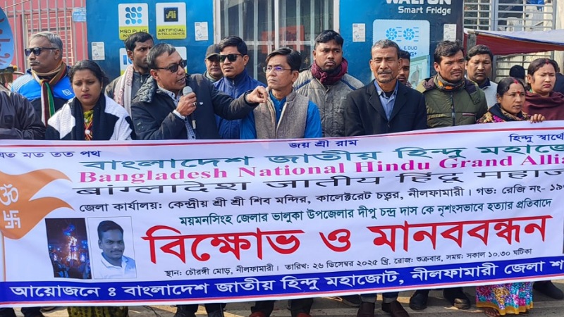 ময়মনসিংহ জেলার ভালুকায় দীপু চন্দ্র দাসকে নিশৃংস ভাবে হত্যার প্রতিবাদে নীলফামারীতে মানববন্ধন ও প্রতিবাদ সমাবেশ অনুষ্ঠিত হয়েছে।